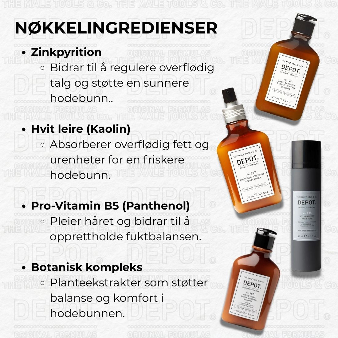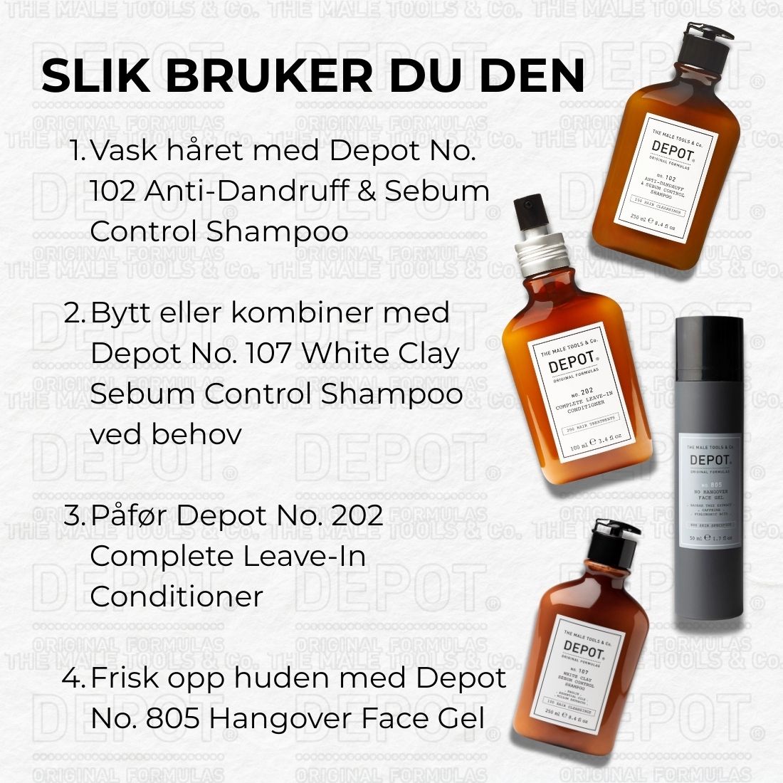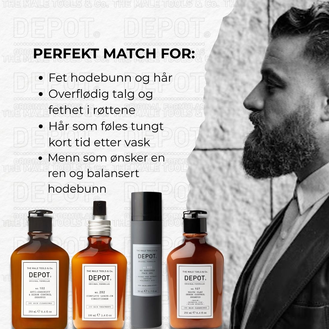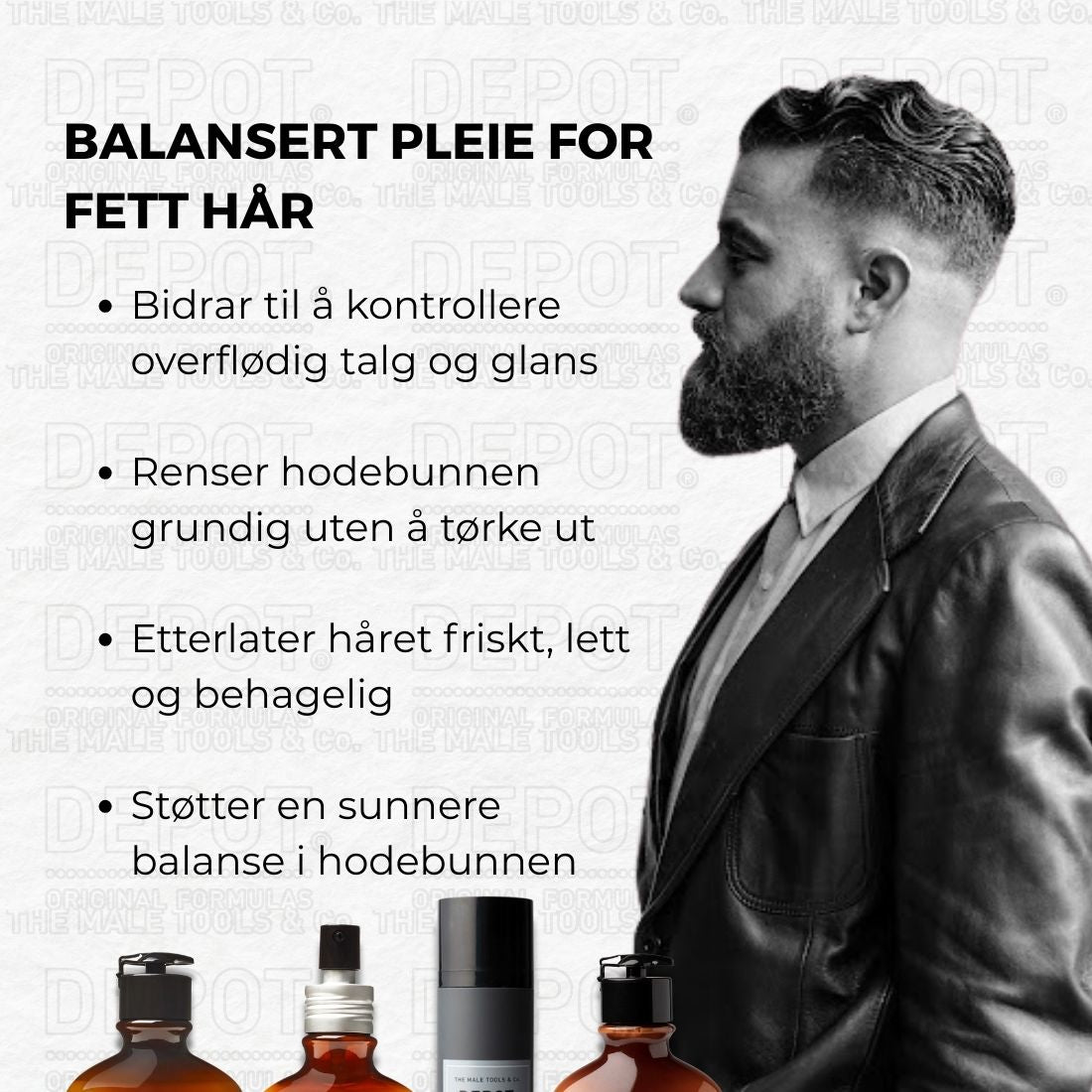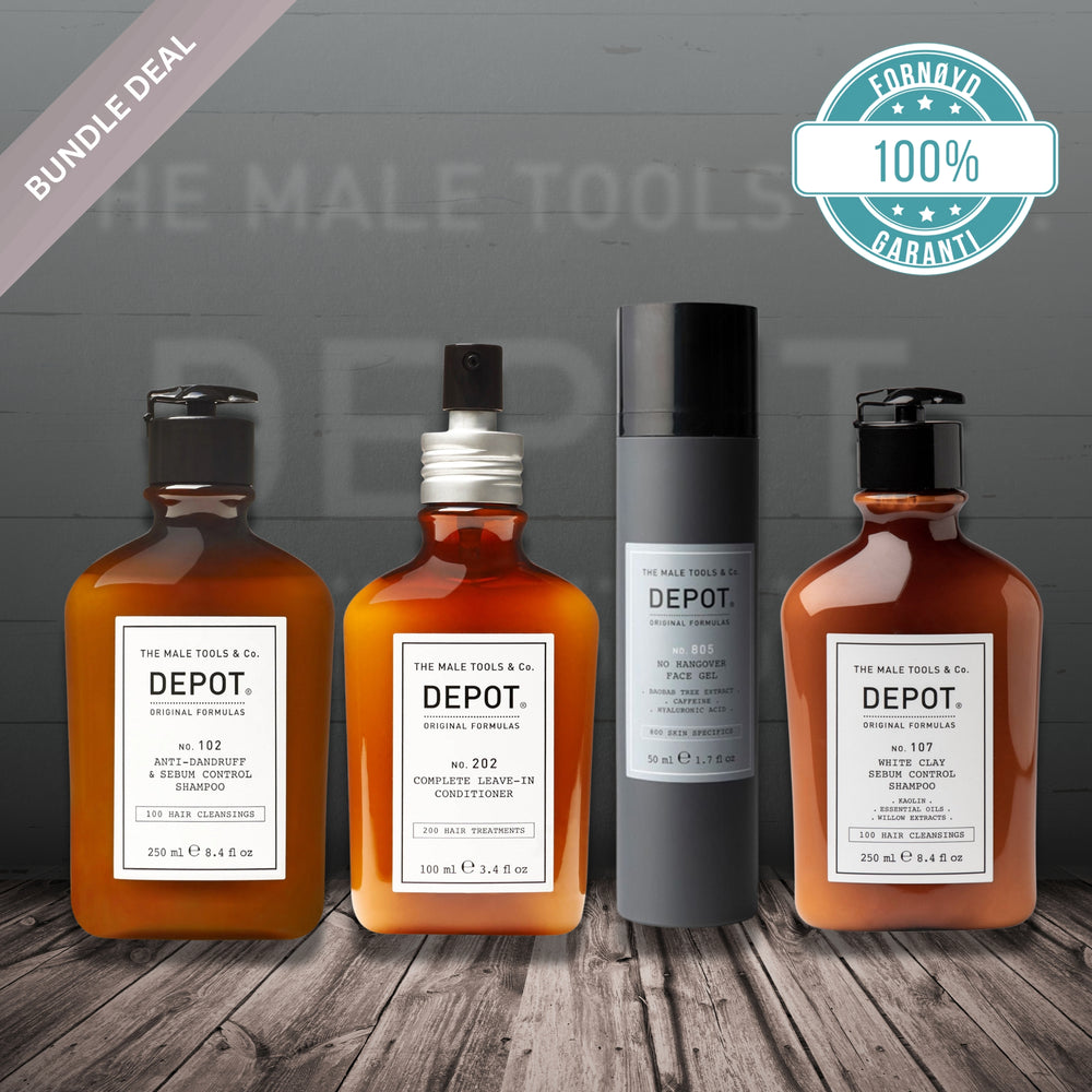 Greasy Scalp / Hair er en målrettet pleie- og behandlingsrutine fra DEPOT, utviklet for fet hodebunn og hår som raskt blir tungt. Bundelen kombinerer to sebumkontrollerende sjampoer, en lett leave-in conditioner og en oppfriskende ansiktsgel – for et rent, balansert og velstelt resultat.